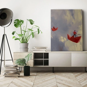 Cuadro mural - Viaje de los Soñadores - Barquitos de papel rojos flotando en las nubes