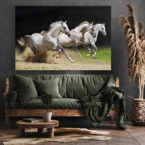 Cuadro sobre lienzo - Impresión de Imagen - Tres caballos blancos galopando sobre arena y hierba. - 50x70cm - Las tres Gracias - Decoración de pared moderna para salón y dormitorio ARTTOR