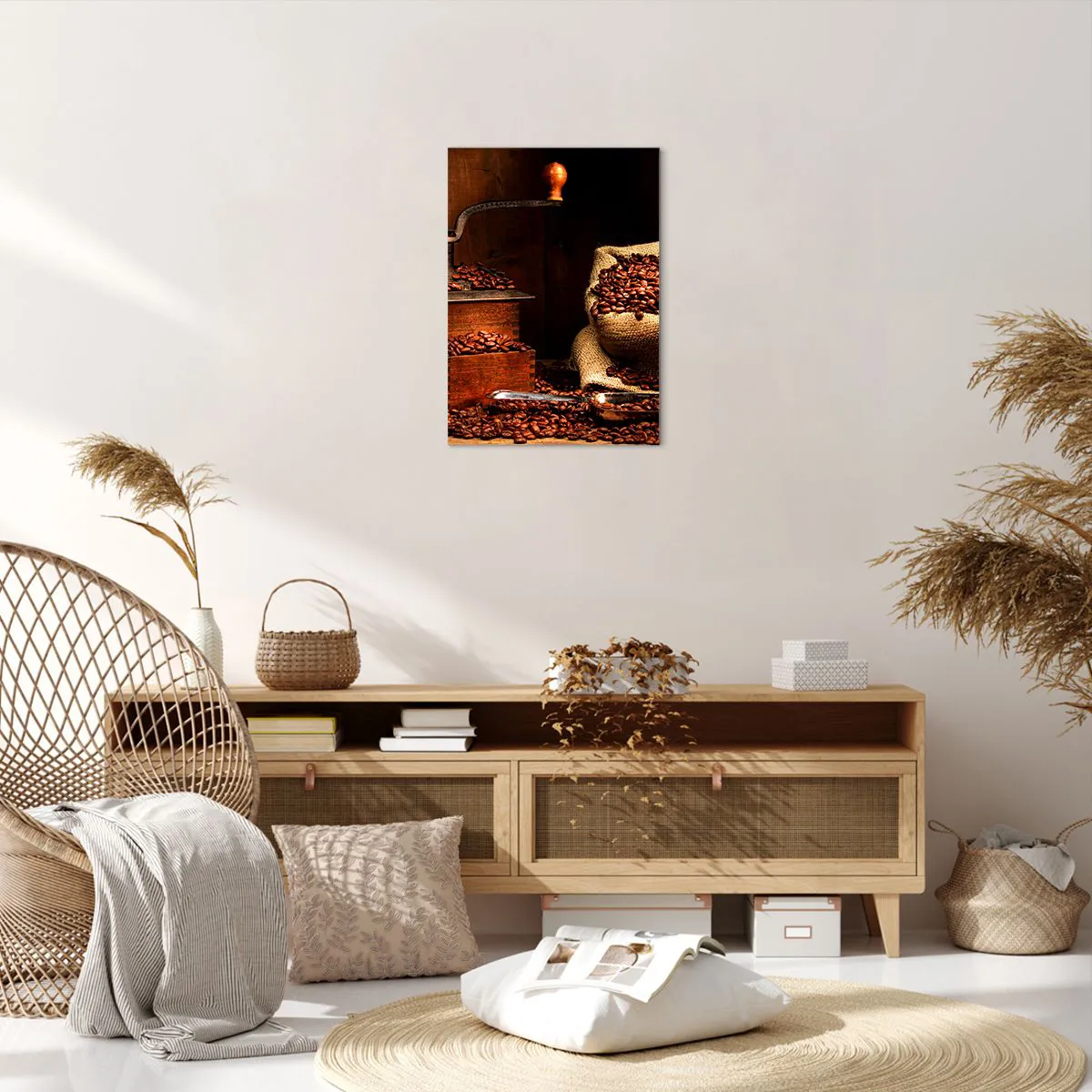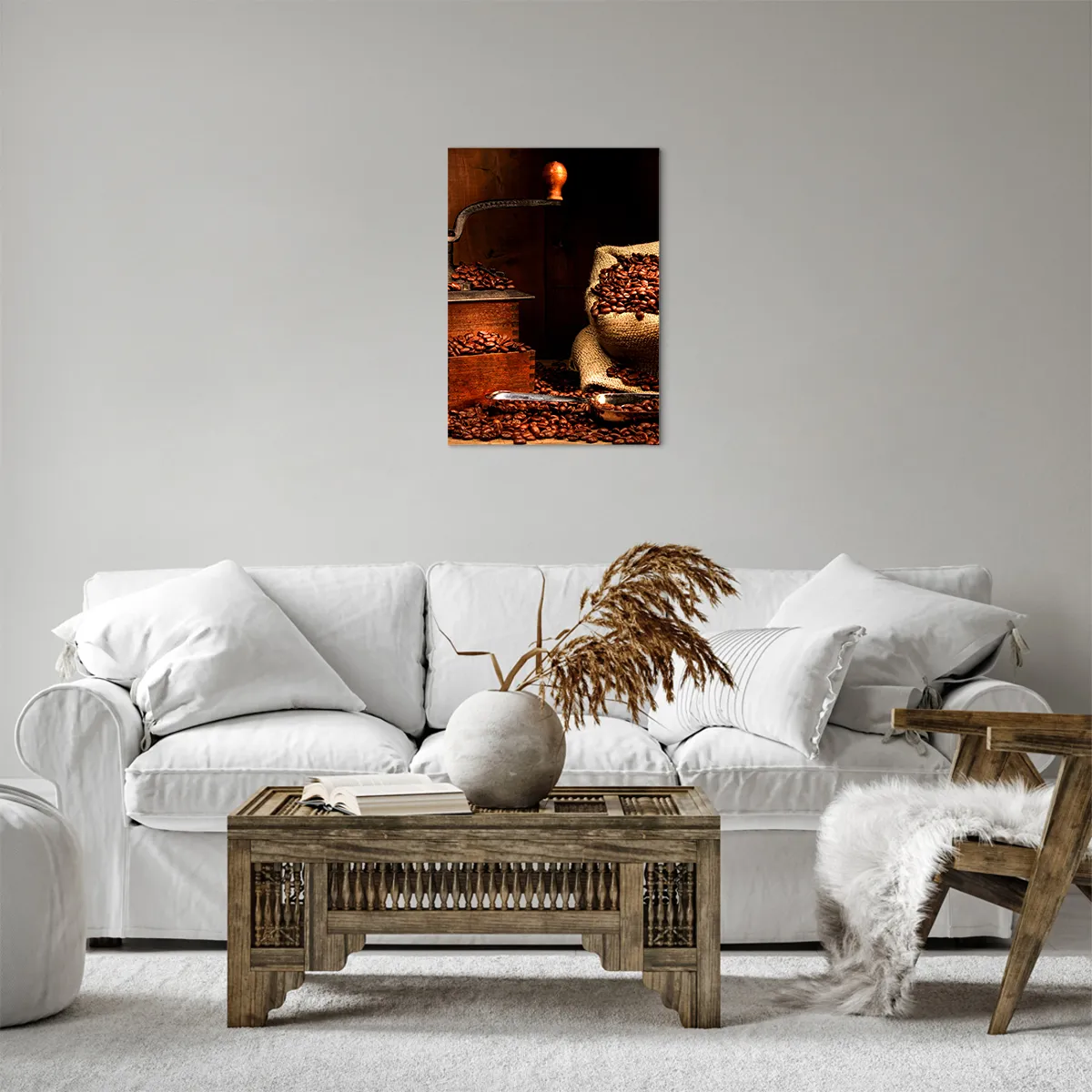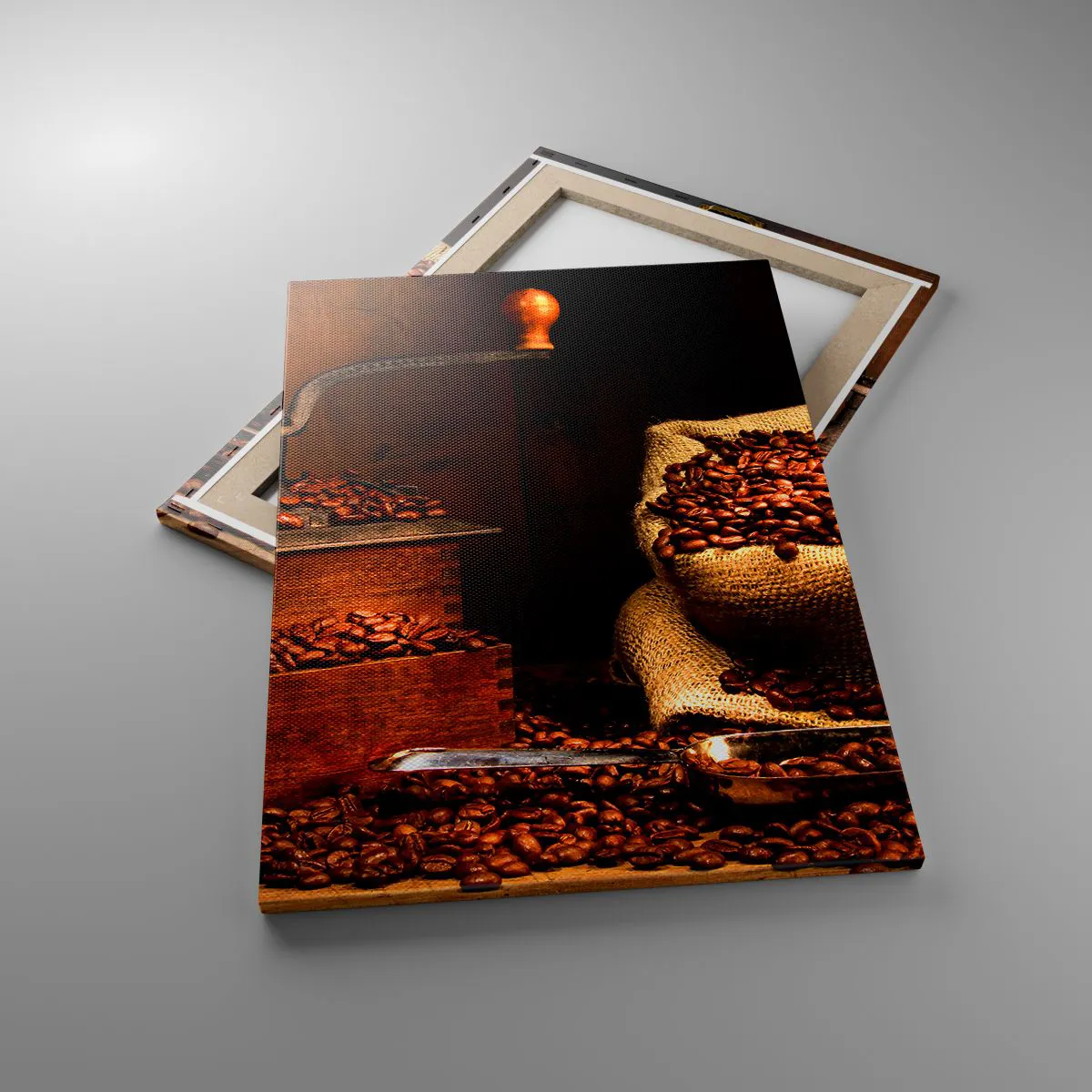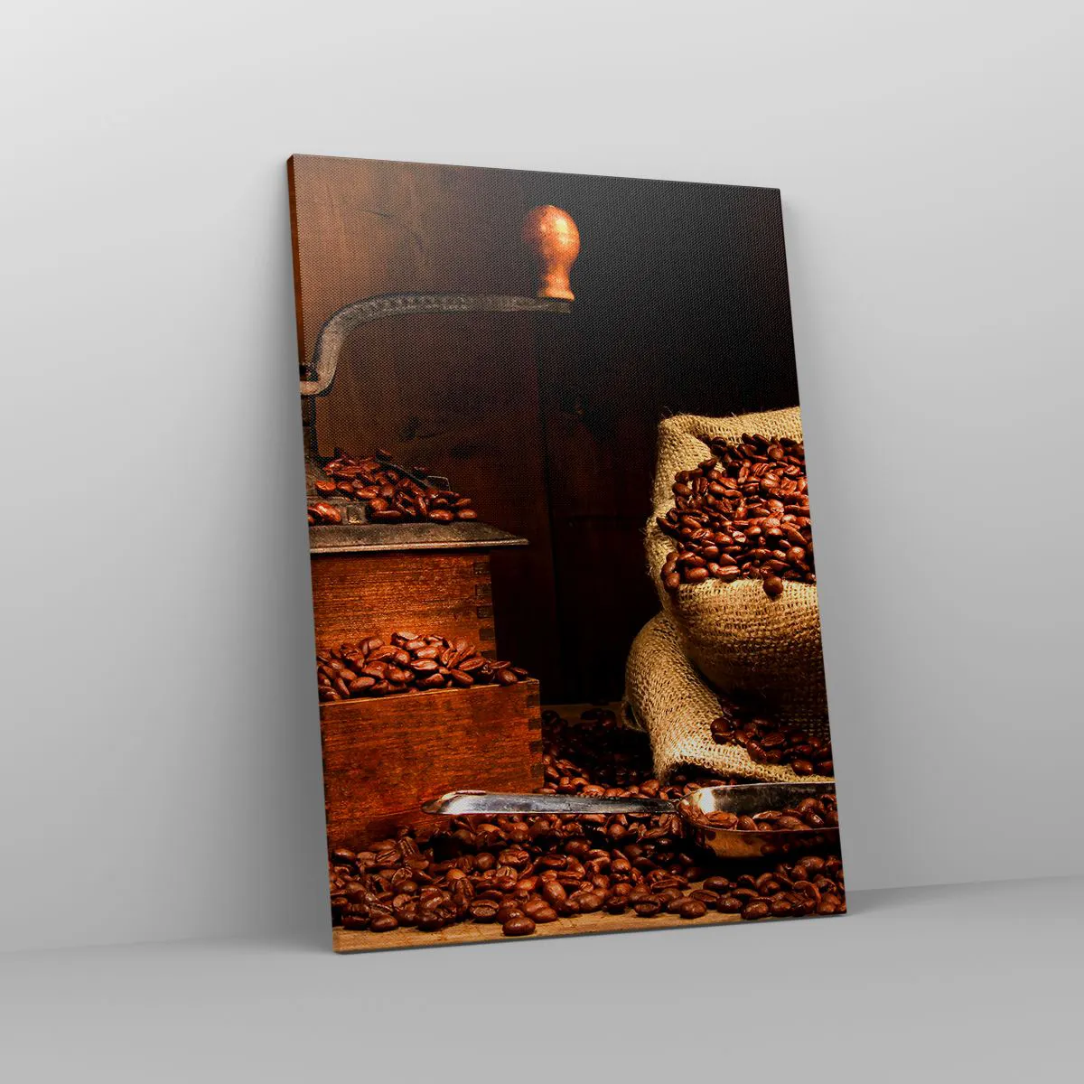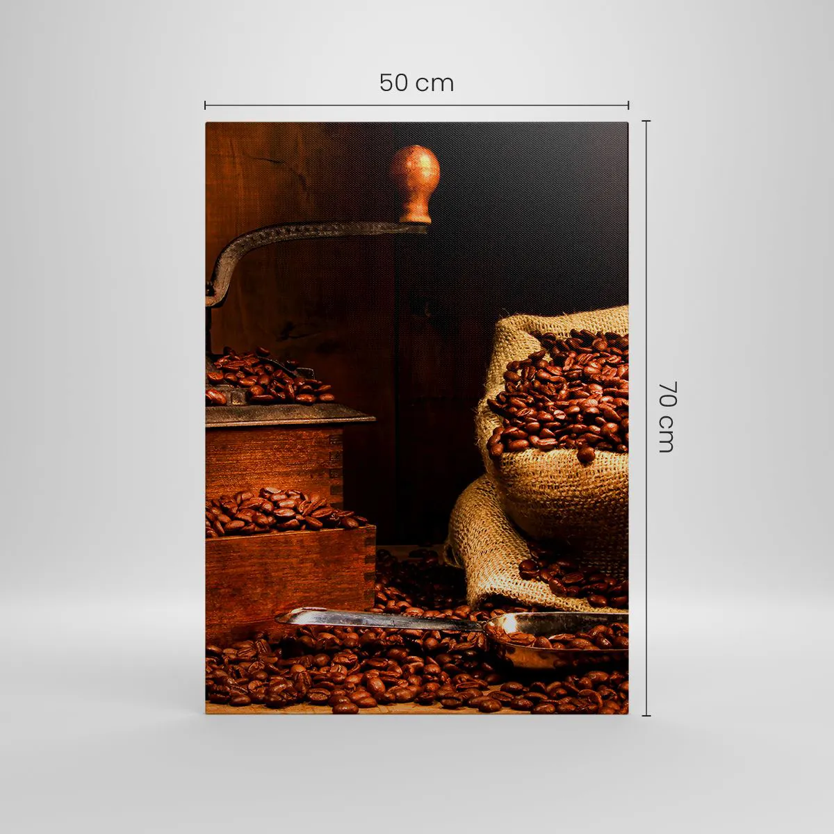 Cuadro sobre lienzo - Impresión de Imagen - Un antiguo molinillo de café con granos y una bolsa en estilo rústico. - 50x70cm - Bodegón con granos de café y molinillo - Decoración de pared moderna para salón y dormitorio ARTTOR