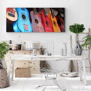 Cuadro sobre lienzo - Impresión de Imagen - Guitarras acústicas de colores cuelgan en fila en exhibición - 50x70cm - Estilo latino - Decoración de pared moderna para salón y dormitorio ARTTOR