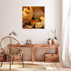 Cuadro sobre lienzo - Impresión de Imagen - Varios panes en una cesta de mimbre sobre un fondo dorado. - 50x70cm - Nos han vuelto a hornear - Decoración de pared moderna para salón y dormitorio ARTTOR