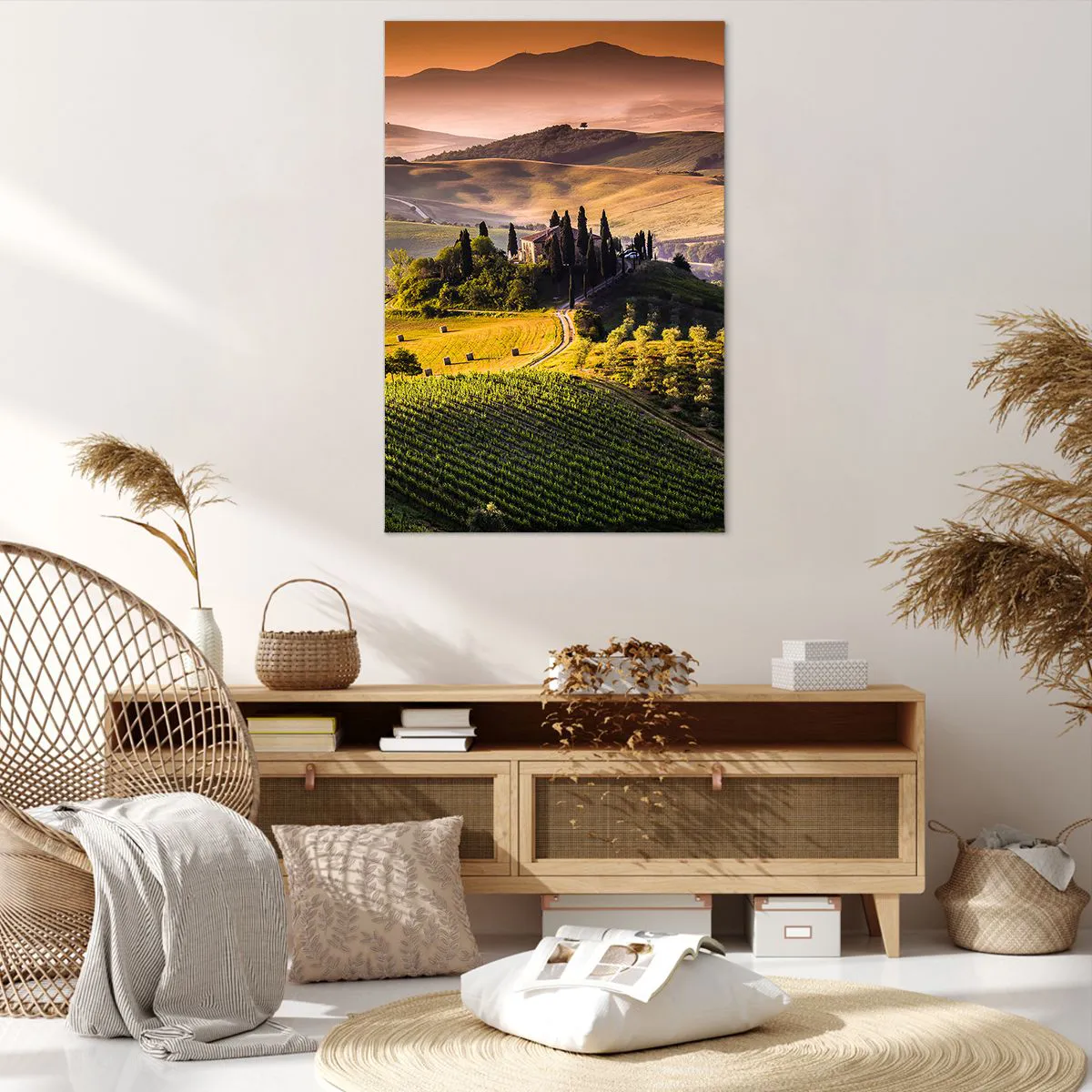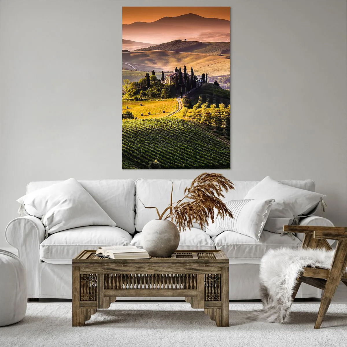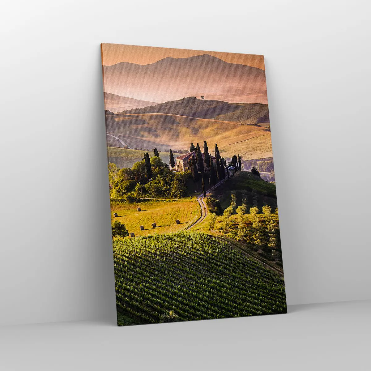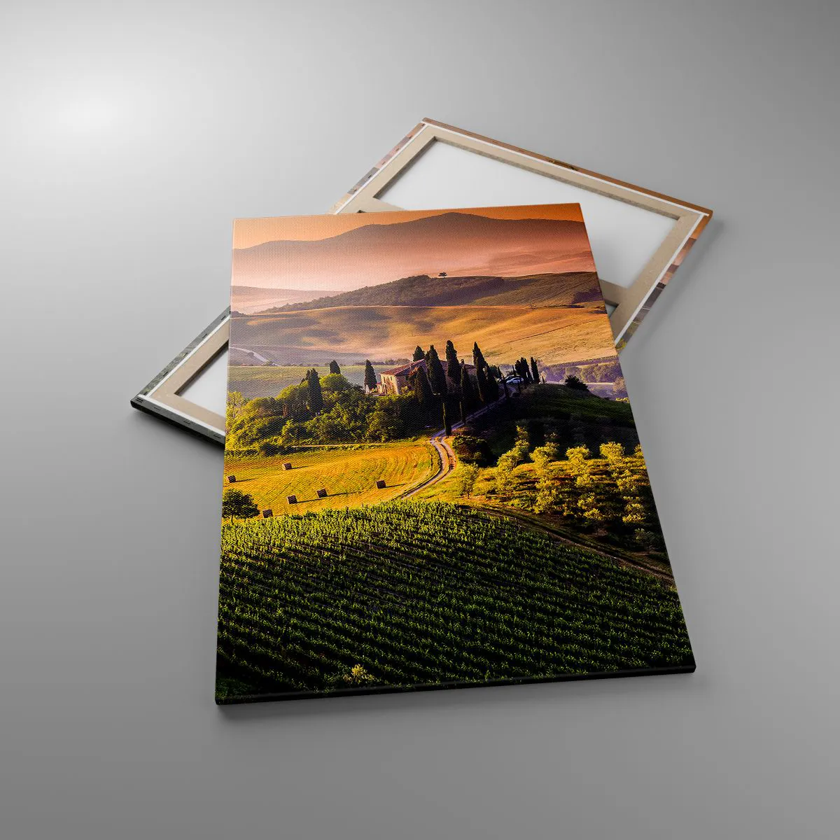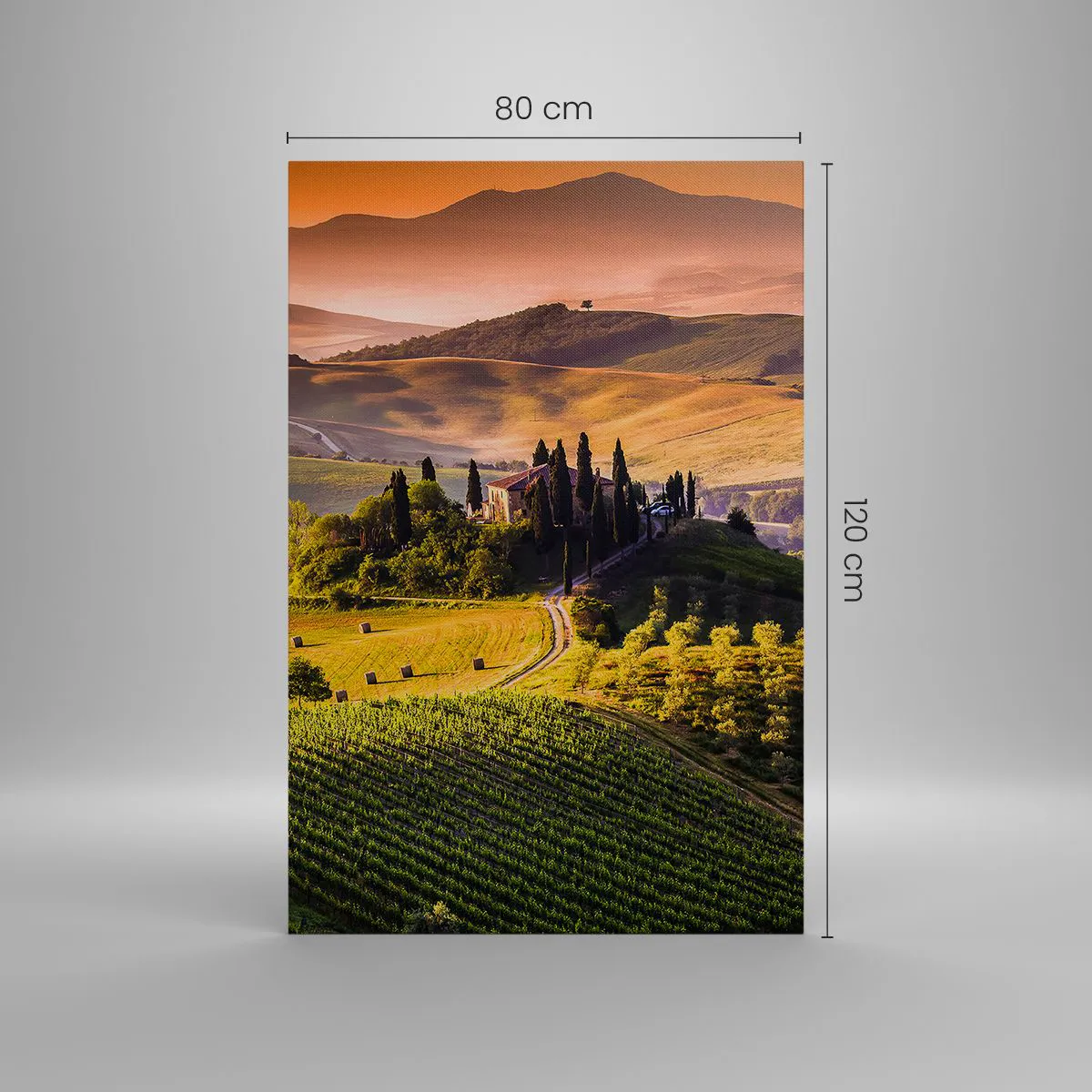 Cuadro sobre lienzo - Impresión de Imagen - Paisaje toscano con viñedos y una casa en una colina. - 80x120cm - Paisaje toscano - Decoración de pared moderna para salón y dormitorio ARTTOR