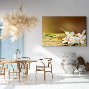 Cuadro sobre lienzo - Impresión de Imagen - Flores blancas sobre un fondo de madera con luz natural. - 50x70cm - Una promesa inocente - Decoración de pared moderna para salón y dormitorio ARTTOR