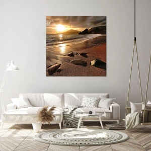 Cuadro sobre lienzo - Impresión de Imagen - Playa al atardecer con piedras en la orilla - 50x70cm - Sigue el sol hacia las colinas - Decoración de pared moderna para salón y dormitorio ARTTOR
