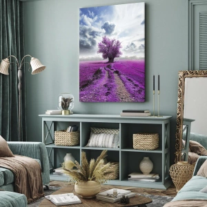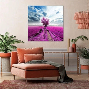 Cuadro sobre lienzo - Impresión de Imagen - Un árbol solitario en un campo de un tono rosa intenso. - 50x70cm - El brezal - un encanto - Decoración de pared moderna para salón y dormitorio ARTTOR