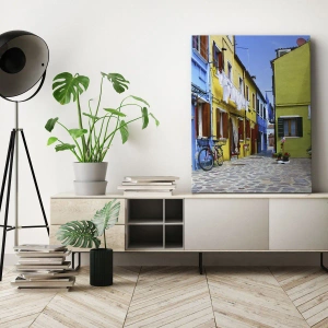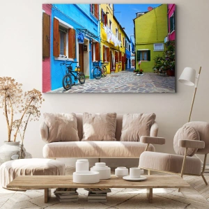 Cuadro sobre lienzo - Impresión de Imagen - Una calle colorida con bicicletas entre edificios de color pastel. - 50x70cm - Callejón dulce de color pastel - Decoración de pared moderna para salón y dormitorio ARTTOR