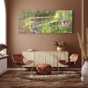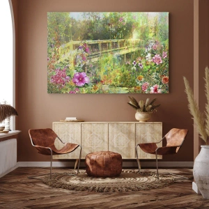 Cuadro sobre lienzo - Impresión de Imagen - Un puente rodeado de exuberante vegetación y flores. - 80x120cm - Un puente de suspiros de primavera - Decoración de pared moderna para salón y dormitorio ARTTOR