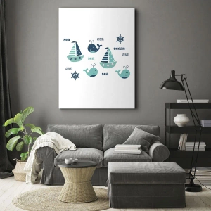 Cuadro sobre lienzo - Impresión de Imagen - Encantadores motivos náuticos con ballenas y veleros. - 70x100cm - A través de mares y océanos - Decoración de pared moderna para salón y dormitorio ARTTOR