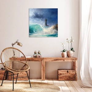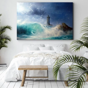 Cuadro sobre lienzo - Impresión de Imagen - Un faro rodeado de fuertes olas y nubes. - 70x100cm - En guardia contra los elementos - Decoración de pared moderna para salón y dormitorio ARTTOR