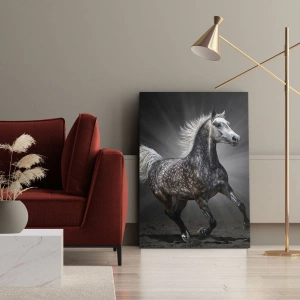 Cuadro sobre lienzo - Impresión de Imagen - Un caballo blanco galopando sobre un fondo oscuro. - 70x100cm - El gris es hermoso - Decoración de pared moderna para salón y dormitorio ARTTOR