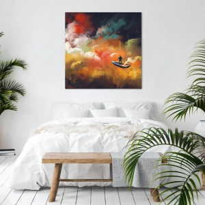 Cuadro sobre lienzo - Impresión de Imagen - Una figura en un barco contra un fondo de nubes de colores. - 50x70cm - En barco por la galaxia - Decoración de pared moderna para salón y dormitorio ARTTOR