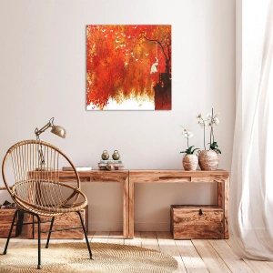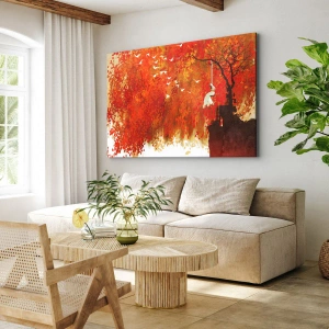 Cuadro sobre lienzo - Impresión de Imagen - Una figura en un columpio junto a un árbol rodeado de hojas rojas. - 50x70cm - ¿Volará con ellos? - Decoración de pared moderna para salón y dormitorio ARTTOR