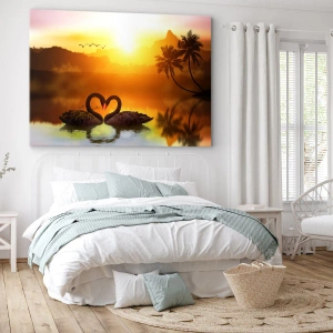 Cuadro sobre lienzo - Impresión de Imagen - Dos cisnes negros formando un corazón con el telón de fondo de un atardecer en el lago. - 80x120cm - Todo a juego - Decoración de pared moderna para salón y dormitorio ARTTOR