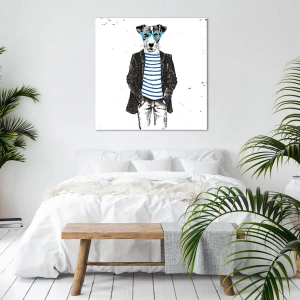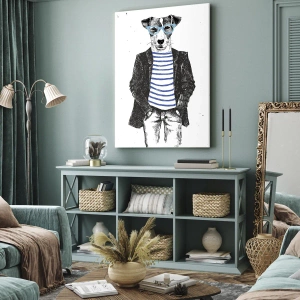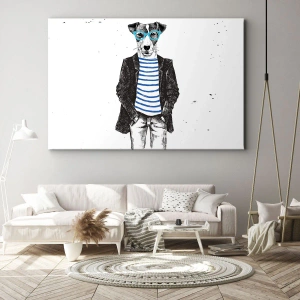 Cuadro sobre lienzo - Impresión de Imagen - Retrato de un perro con gafas y camisa de marinero en estilo humorístico. - 120x80cm - El encanto del perro - Decoración de pared moderna para salón y dormitorio ARTTOR