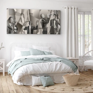 • Una composición abstracta que representa a músicos de jazz tocando diversos instrumentos en una paleta monocromática. Una imagen perfecta para los amantes de la música y del diseño moderno, que aporta armonía a cualquier interior.