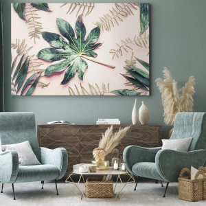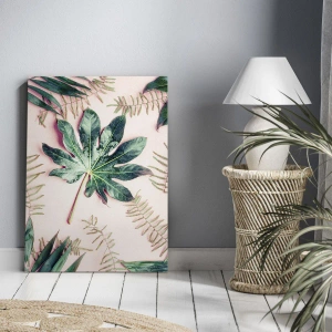 Cuadro sobre lienzo - Impresión de Imagen - Hojas tropicales sobre un fondo pastel claro. - 50x70cm - Estudio de vegetación sobre fondo rosa - Decoración de pared moderna para salón y dormitorio ARTTOR
