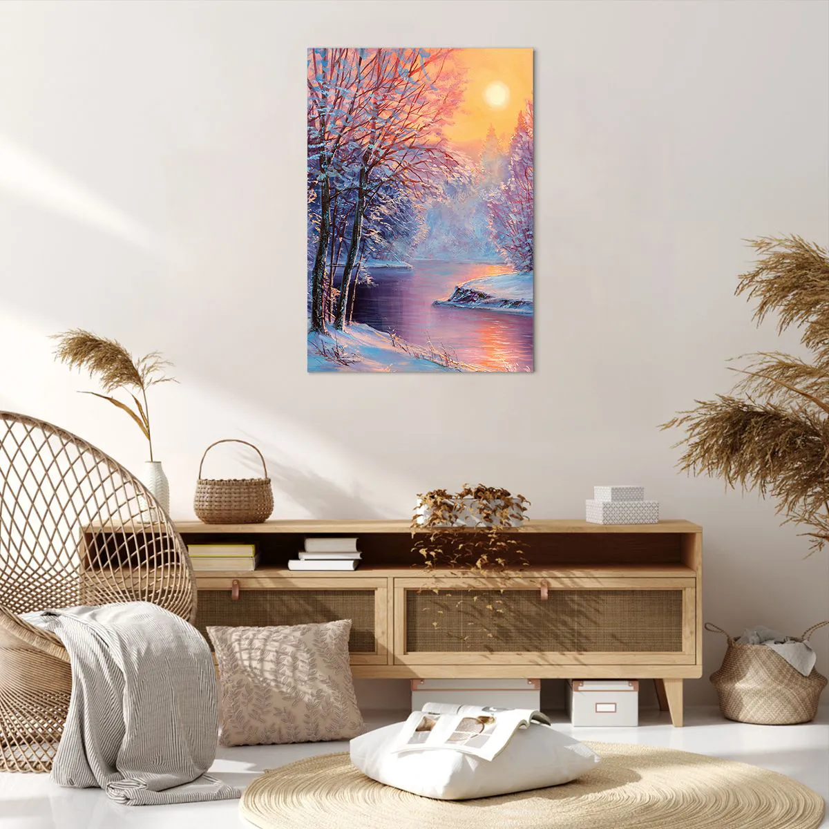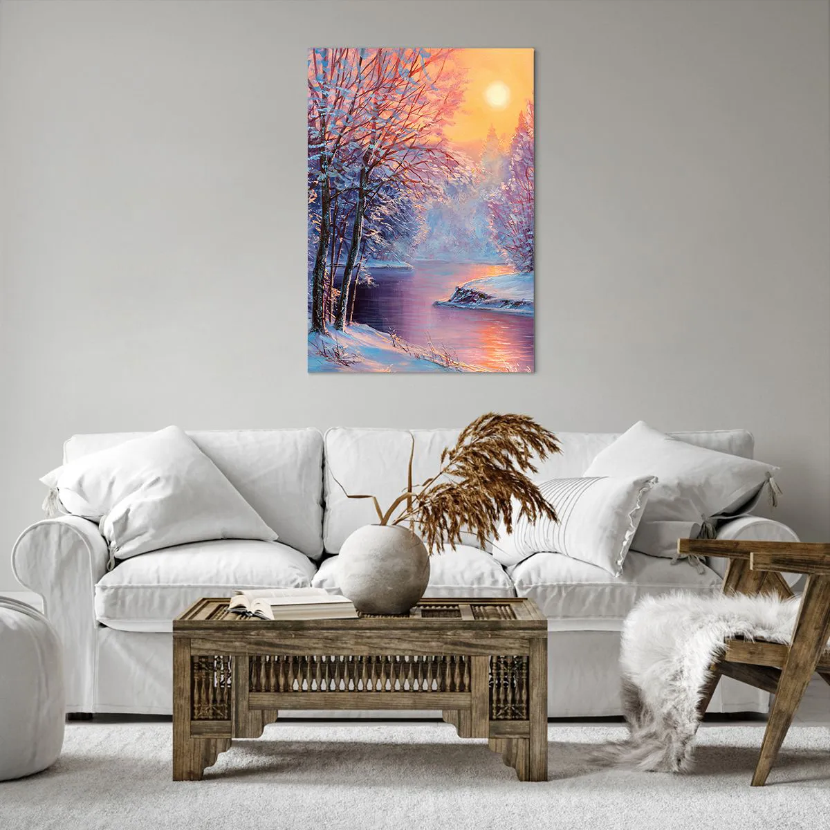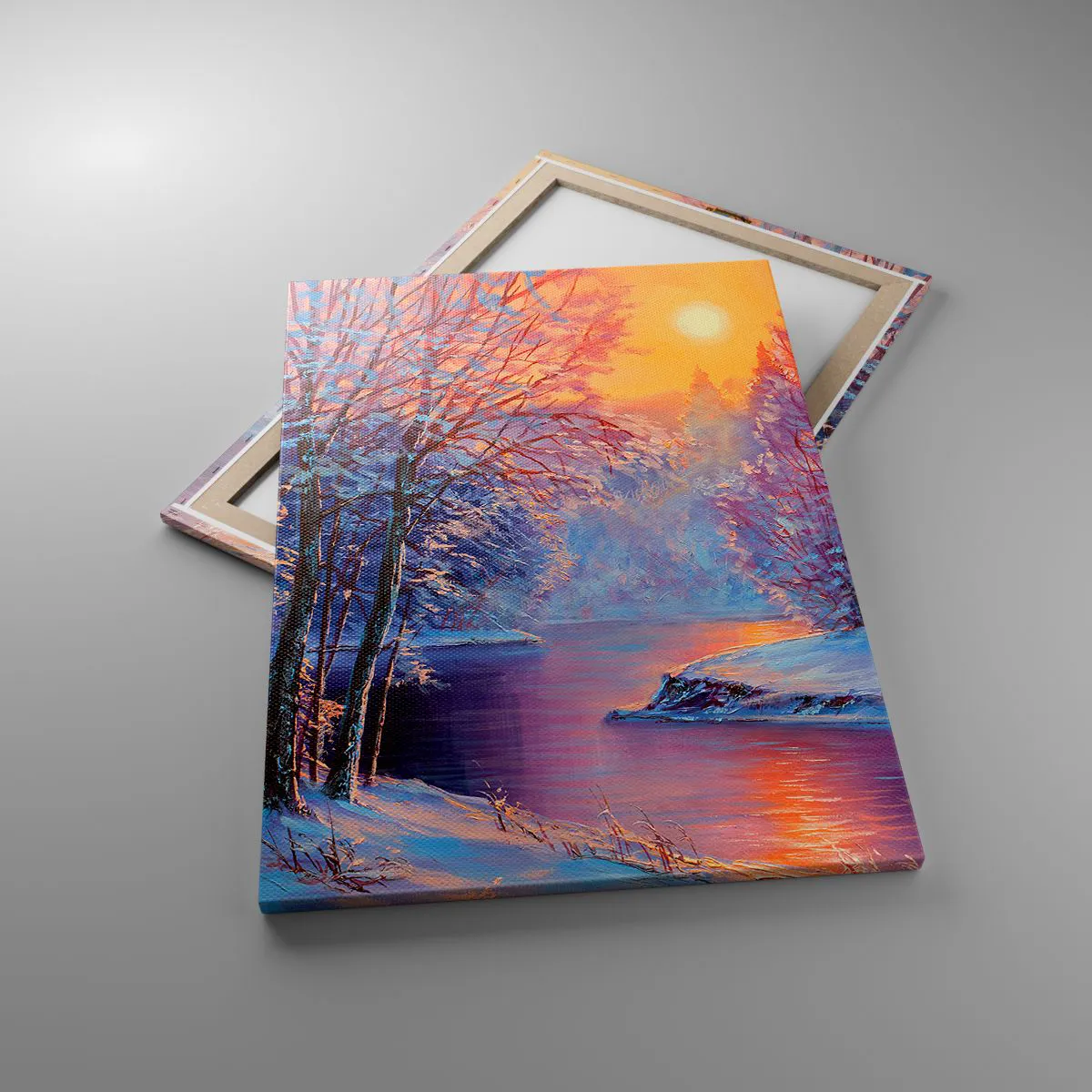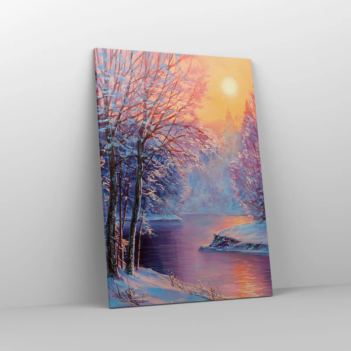Cuadro sobre lienzo - Impresión de Imagen - Paisaje invernal con río y árboles al amanecer. - 70x100cm - Colores del invierno - Decoración de pared moderna para salón y dormitorio ARTTOR