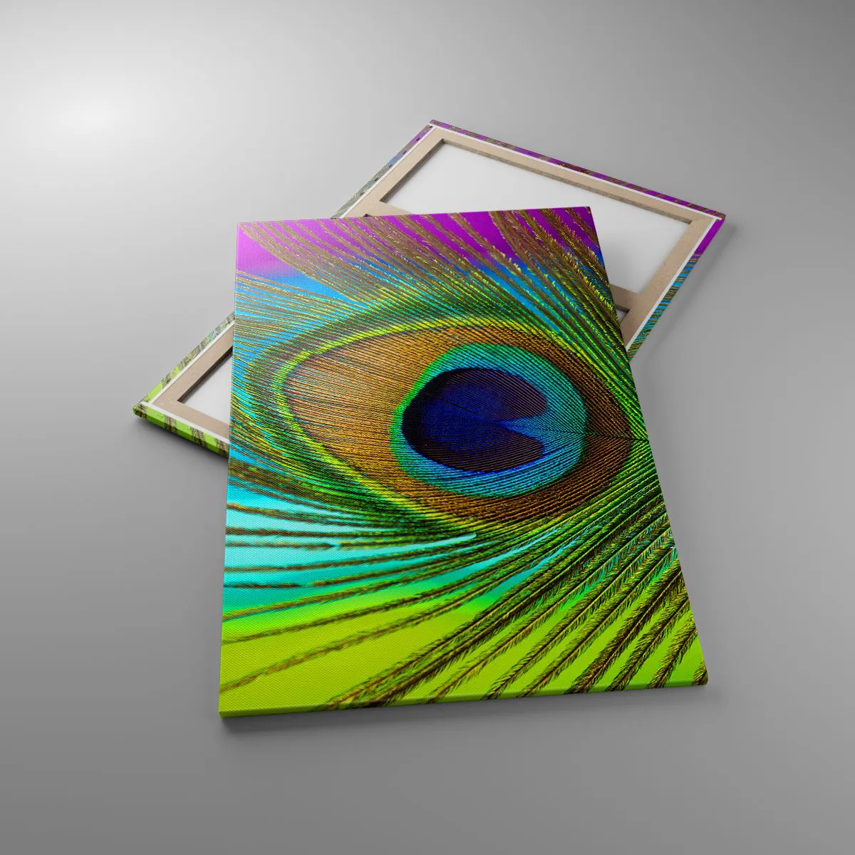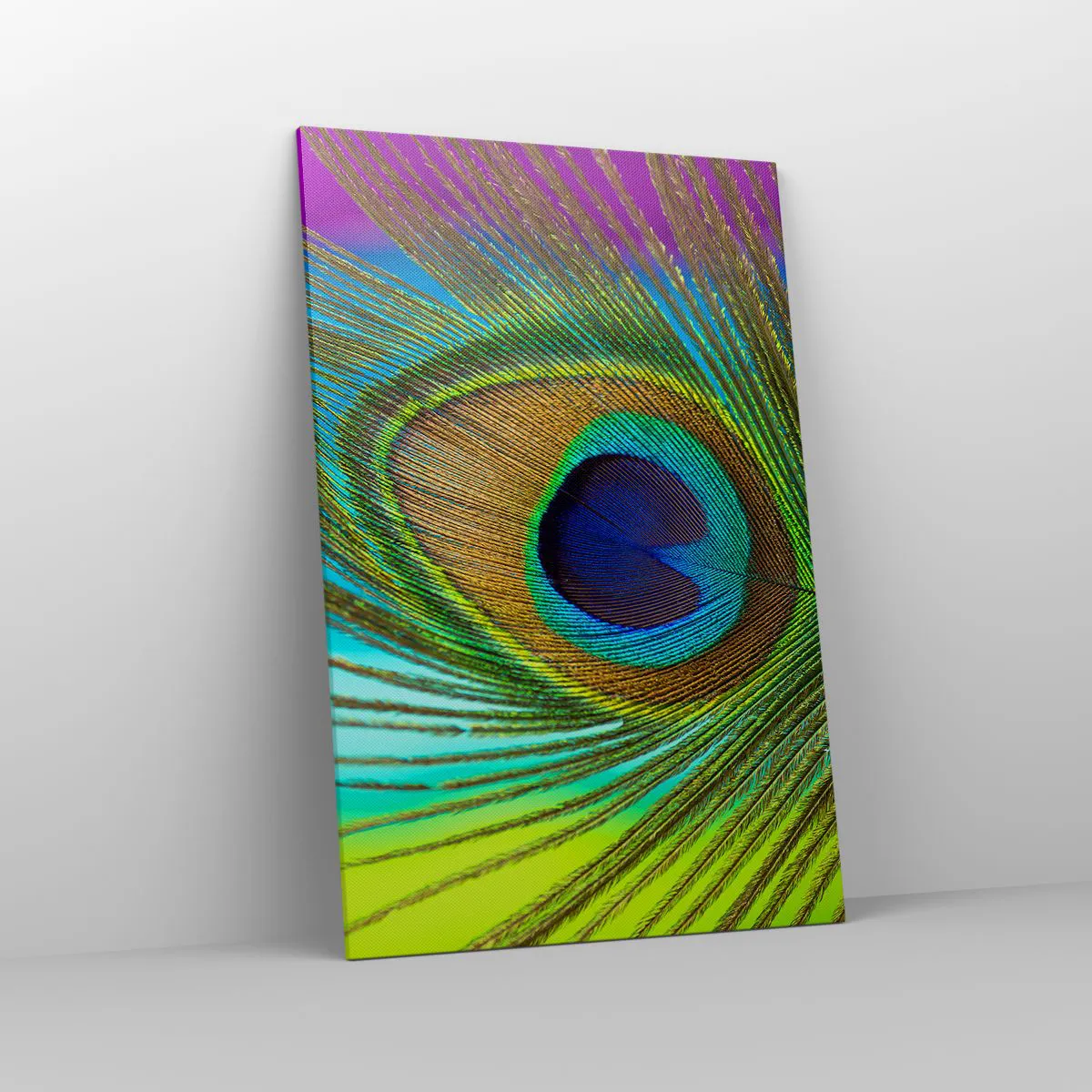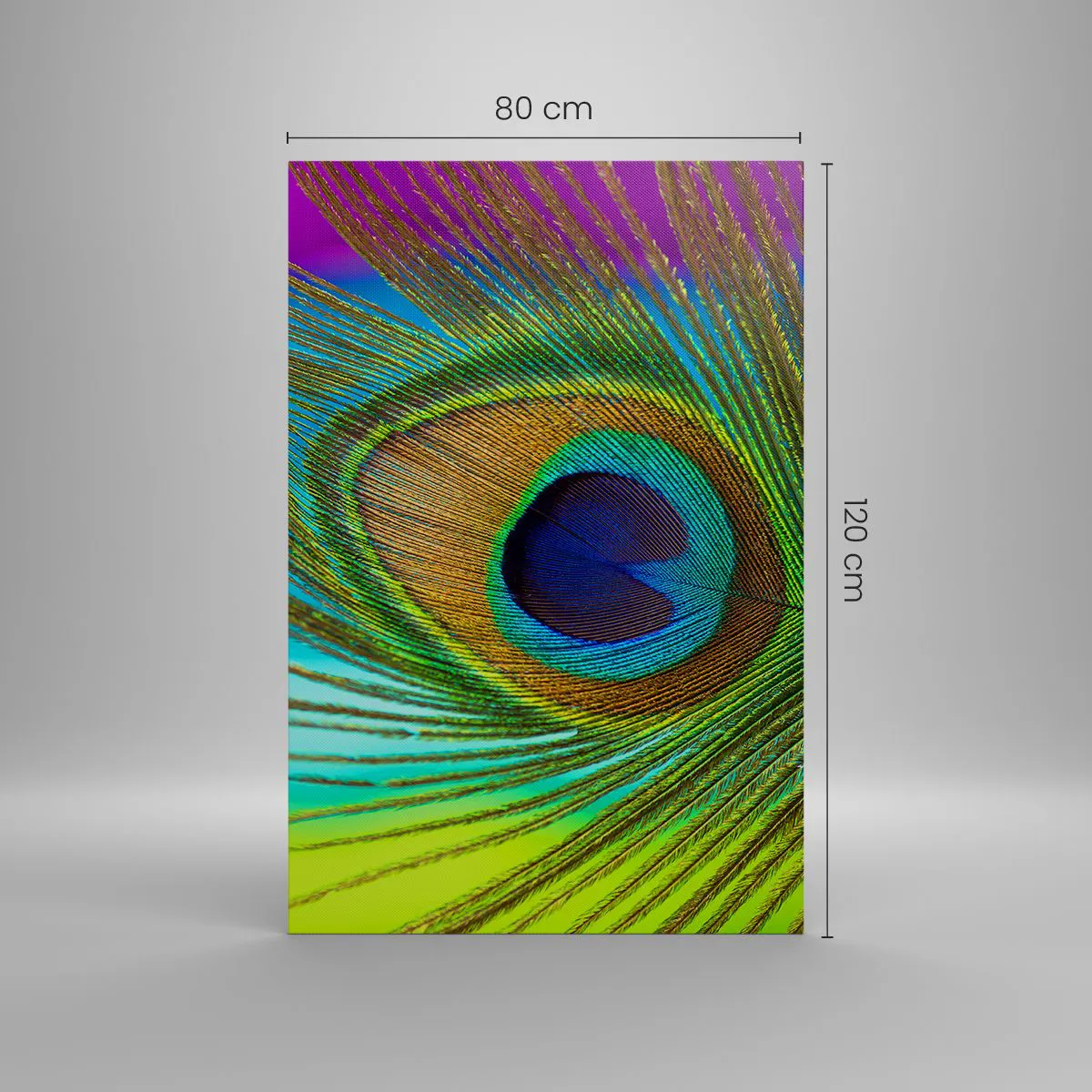 Cuadro sobre lienzo - Impresión de Imagen - Primer plano de una pluma de pavo real con colores vivos. - 80x120cm - Cara a cara - Decoración de pared moderna para salón y dormitorio ARTTOR
