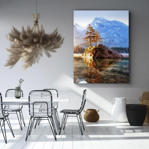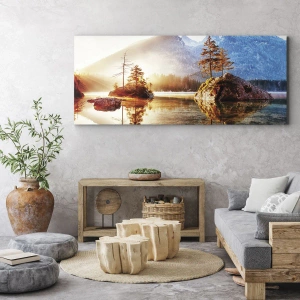 Cuadro sobre lienzo - Impresión de Imagen - Un lago con islas y montañas al fondo al amanecer. - 50x70cm - La naturaleza bajo la luz - Decoración de pared moderna para salón y dormitorio ARTTOR