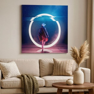 Cuadro sobre lienzo - Impresión de Imagen - Un personaje en un entorno futurista con un círculo de neón. - 70x50cm - Entre mundos - Decoración de pared moderna para salón y dormitorio ARTTOR