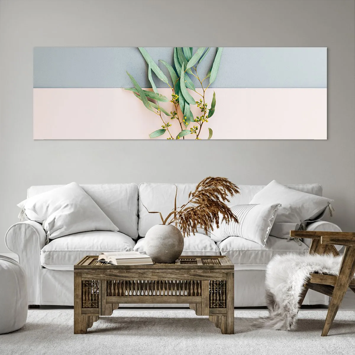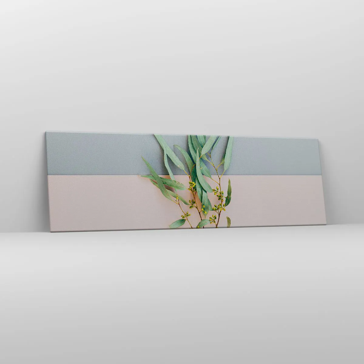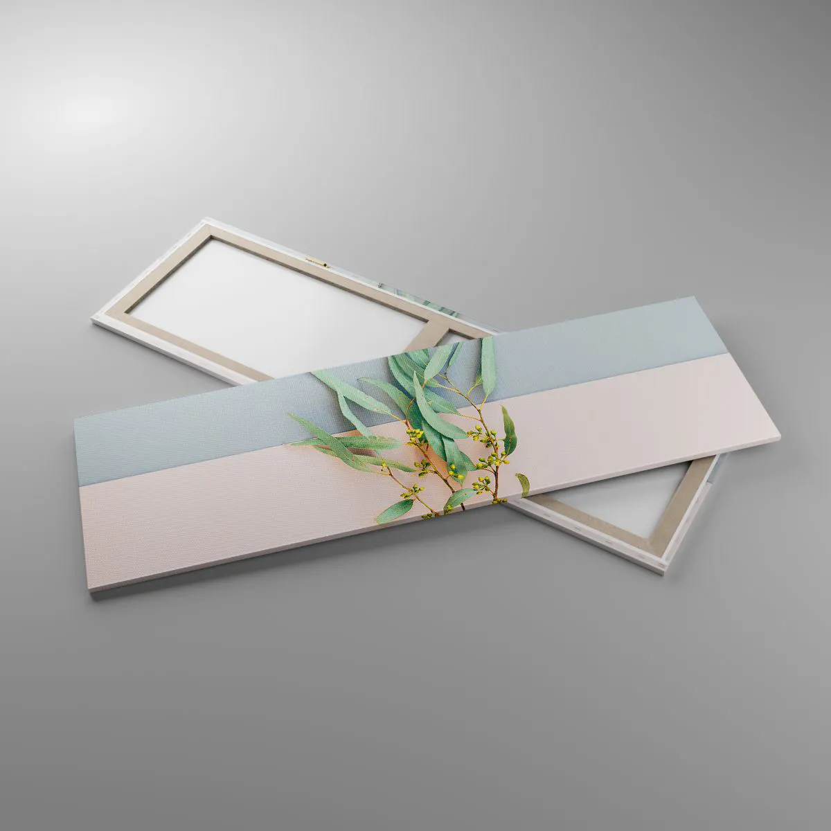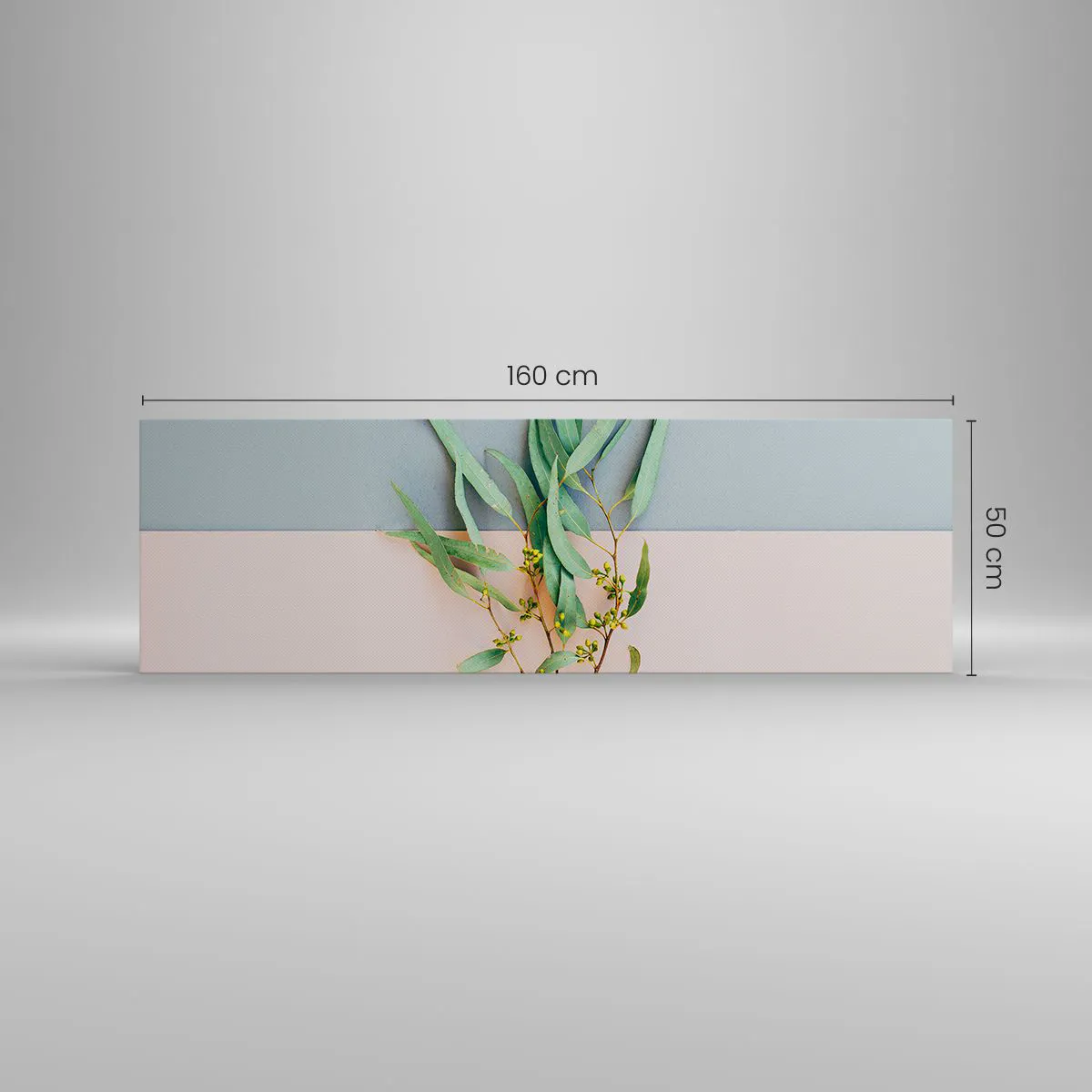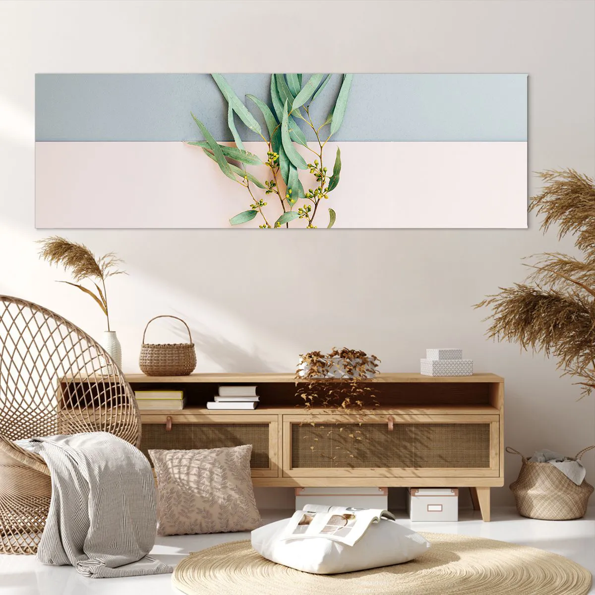 Cuadro sobre lienzo - Impresión de Imagen - Una rama con hojas sobre un fondo de tonos pastel. - 160x50cm - La sutileza del pastel - Decoración de pared moderna para salón y dormitorio ARTTOR