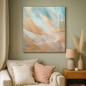 Cuadro sobre lienzo - Impresión de Imagen - Delicadas plumas en tonos pastel de azul y naranja. - 140x50cm - En la tierra de la suavidad - Decoración de pared moderna para salón y dormitorio ARTTOR