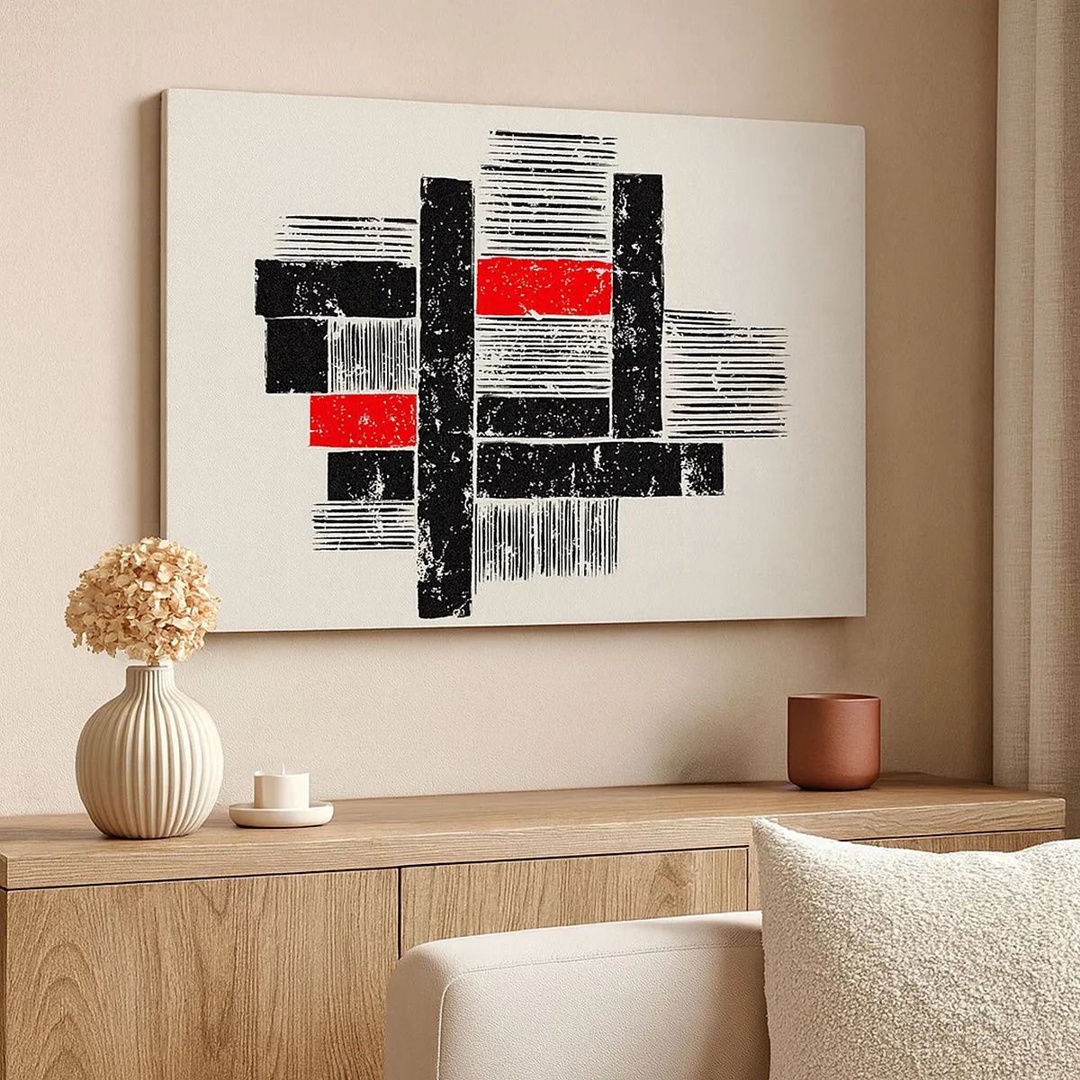 Las líneas y rectángulos dominantes crean una estructura dinámica que mantiene el equilibrio y la estética a la vez. El contraste entre el rojo intenso y el negro profundo enfatiza el carácter gráfico de la imagen, otorgándole claridad y singularidad. Esta imagen encaja a la perfección en interiores modernos e industriales, aportando estilo y expresión creativa.