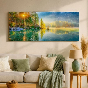 Cuadro sobre lienzo - Impresión de Imagen - Un lago rodeado de montañas y bosques bajo los rayos del sol. - 160x50cm - Majestuosidad y dulzura - Decoración de pared moderna para salón y dormitorio ARTTOR