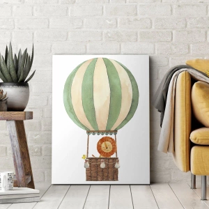 - El cuadro representa un globo pastel con un león sonriente en una canasta, perfecto como decoración para la habitación de un niño.