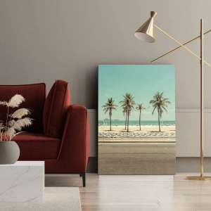 El lienzo "En la Playa" es una decoración que nos transporta a un ambiente tropical. Representa una pintoresca vista de palmeras en una playa de arena, tras la cual se extiende el mar en calma y un cielo azul brillante. El conjunto crea una composición llena de armonía y relajación.