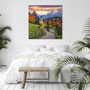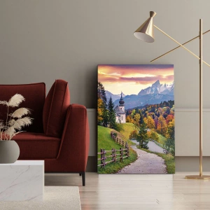 Cuadro sobre lienzo de 70 x 50 cm en formato horizontal. "Paisaje como un cuadro" representa un pintoresco paisaje otoñal. En primer plano, vemos una encantadora capilla rodeada de coloridos árboles, y al fondo, majestuosas montañas iluminadas por el sol poniente.