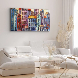 El lienzo horizontal de 70 x 50 cm "Ciudad de cuento de hadas" representa coloridas casas de vecindad junto al agua, ejecutadas con un estilo artístico. Los colores vibrantes y los detalles arquitectónicos crean una composición única que aporta una atmósfera de inspiración y relajación al interior.