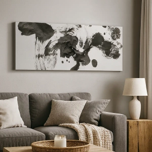 - La pintura representa una composición abstracta de manchas negras sobre fondo blanco, creando un contraste impactante y un equilibrio entre el caos y la armonía. Complementa a la perfección los espacios modernos, aportando un toque dinámico y artístico.