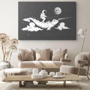La paleta de colores minimalista, basada en tonos grises y blancos, le da a la pintura un carácter moderno. Detalles como el casco del astronauta y la imagen realista de un narval atraen la atención y hacen que la obra destaque. Este motivo único es perfecto para espacios que necesitan un toque creativo: salones, oficinas e incluso habitaciones juveniles.