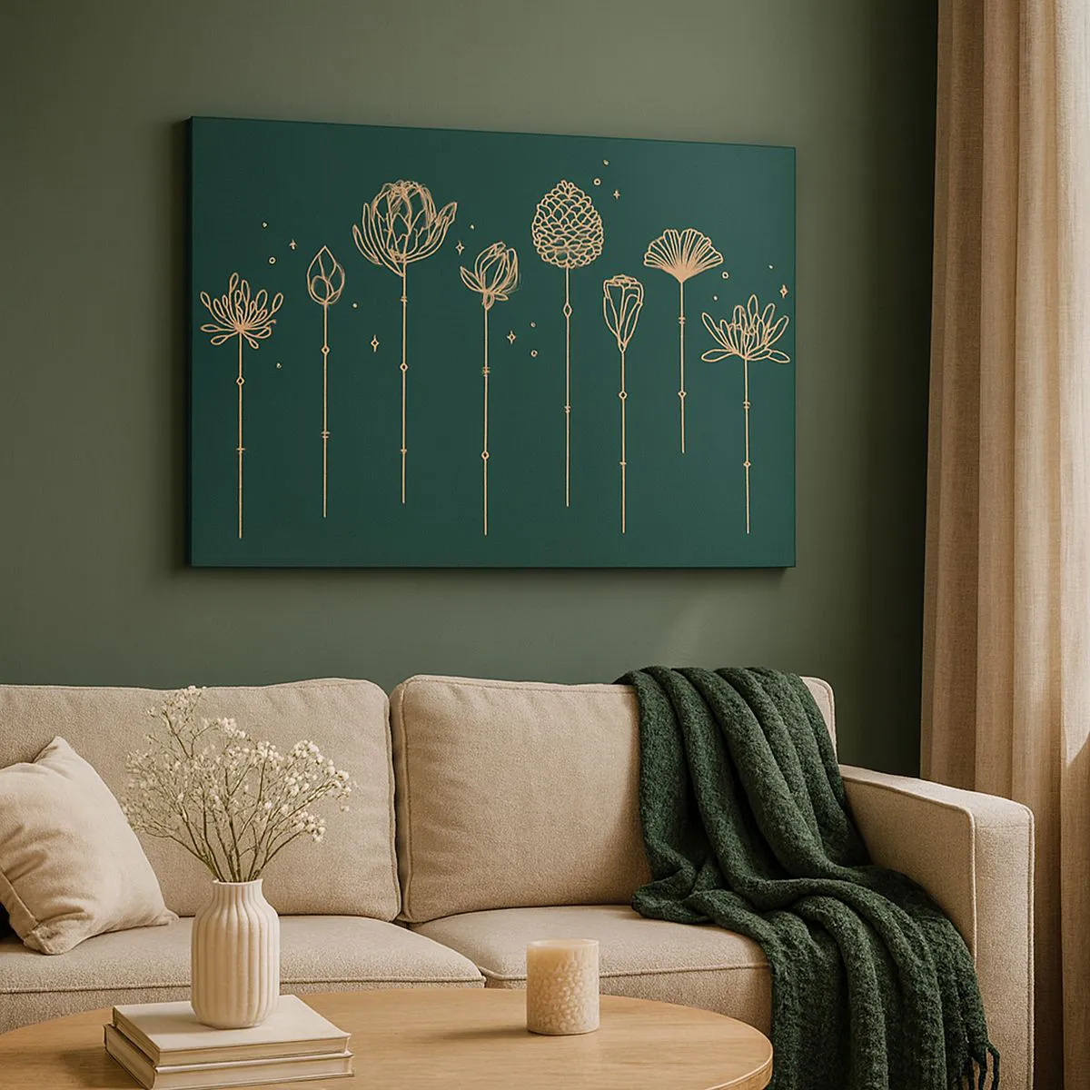 Cuadro sobre lienzo - Impresión de Imagen - Dibujos dorados de hierbas sobre un fondo verde oscuro. - 70x50cm - La familia vegetal - Decoración de pared moderna para salón y dormitorio ARTTOR