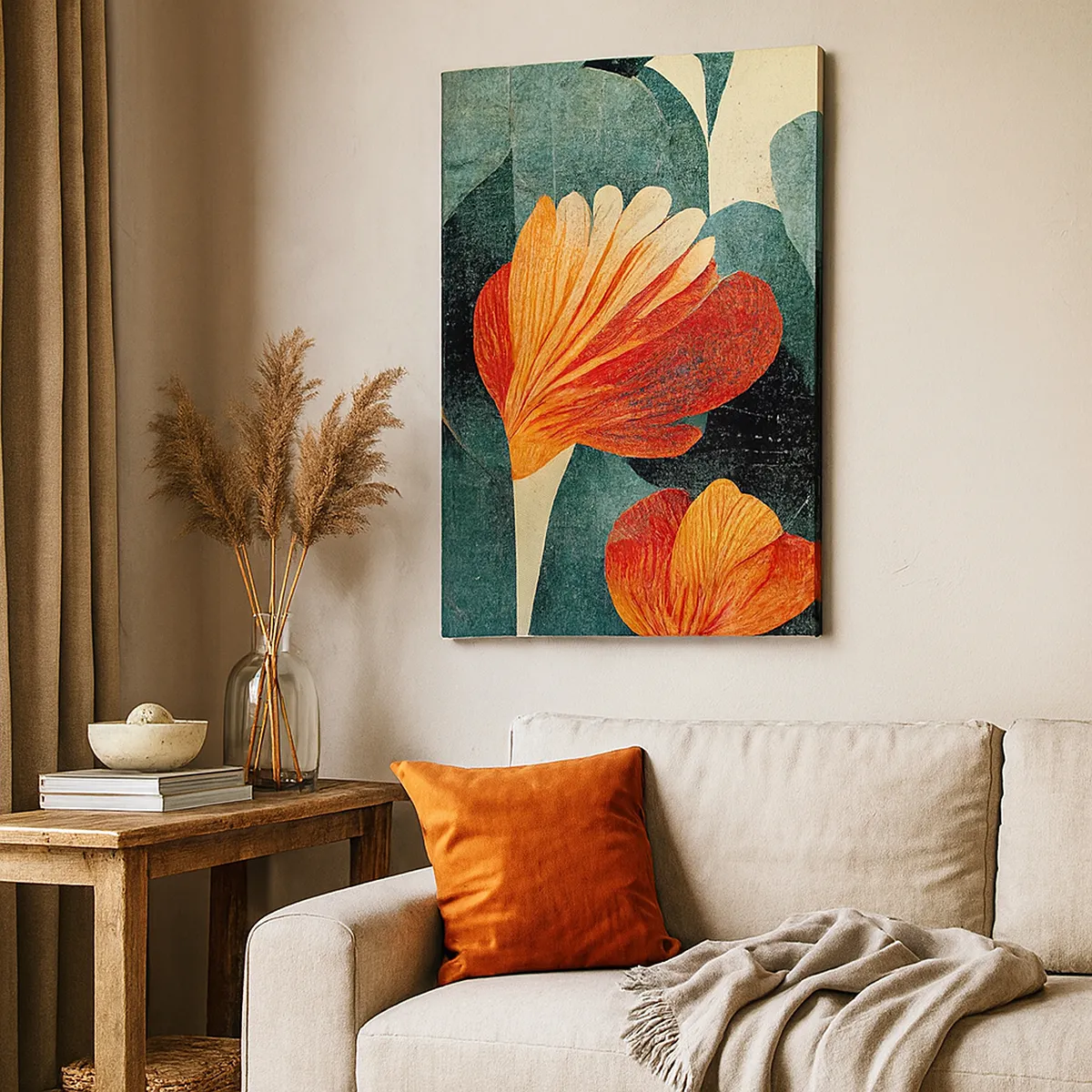Cuadro sobre lienzo - Impresión de Imagen - Flores en tonos intensos de naranja y verde. - 80x120cm - El calor del trópico y el frescor del verdor - Decoración de pared moderna para salón y dormitorio ARTTOR