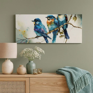 Cuadro mural - ¿Ofendida? - Tres pájaros coloridos en una rama en estilo acuarela