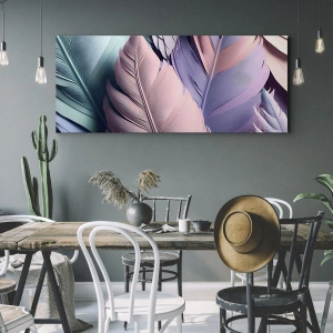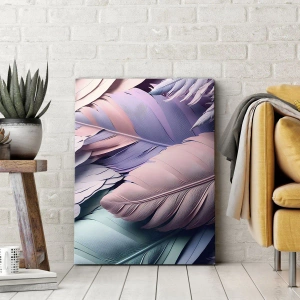 - Este lienzo representa plumas de colores en tonos pastel sobre un fondo claro. Una composición sutil y elegante, perfecta para interiores modernos.