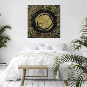 - Este lienzo presenta una composición geométrica en negro y dorado con rayos radiantes. Una decoración elegante, perfecta para interiores modernos y lujosos.