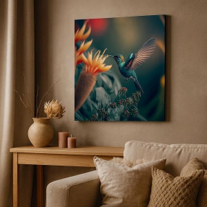 Cuadro sobre lienzo - Impresión de Imagen - Un colibrí colorido junto a las flores contra un fondo natural. - 70x50cm - Una vida verdaderamente colorida - Decoración de pared moderna para salón y dormitorio ARTTOR