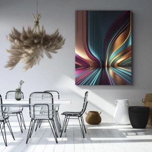 • Este lienzo de 70 x 50 cm representa una abstracción futurista con colores y curvas intensos. Una excelente opción para interiores modernos y elegantes.