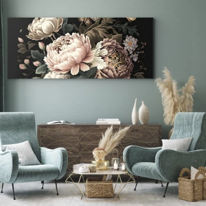 Cuadro sobre lienzo - Impresión de Imagen - Un ramo de flores rosas y mariposas sobre un fondo negro. - 70x100cm - En estilo barroco - Decoración de pared moderna para salón y dormitorio ARTTOR