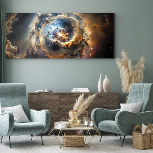 - La pintura representa una visión abstracta de una explosión cósmica, con una dinámica combinación de oro y azul. Perfecta para interiores modernos.