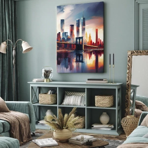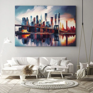 Cuadro sobre lienzo - Impresión de Imagen - Panorama de la ciudad de Nueva York con puente y reflejo en el agua - 120x50cm - Nueva York siempre luce - Decoración de pared moderna para salón y dormitorio ARTTOR