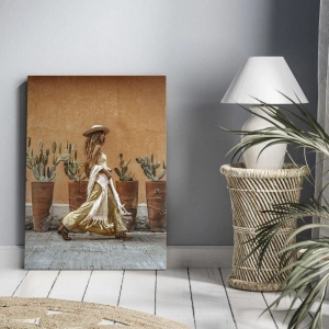 Cuadro sobre lienzo - Impresión de Imagen - Una mujer en estilo boho con macetas de cactus al fondo. - 80x120cm - Estilo hippie - Decoración de pared moderna para salón y dormitorio ARTTOR