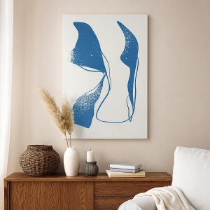 - Este lienzo de 70 x 50 cm representa formas abstractas en tonos azules sobre un fondo blanco. Ideal para interiores modernos, aporta sutileza y expresión artística.