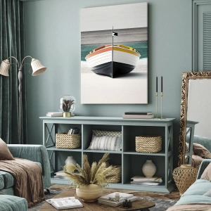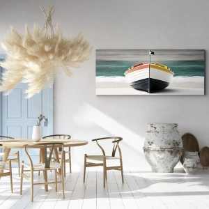 Cuadro sobre lienzo - Impresión de Imagen - Un barco en la playa con un mar turquesa al fondo. - 160x50cm - En su lugar exacto - Decoración de pared moderna para salón y dormitorio ARTTOR