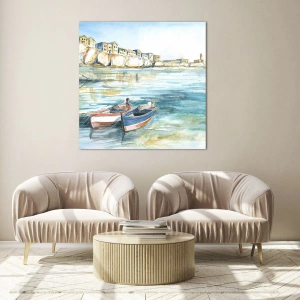 Cuadro sobre vidrio - Impresiones sobre Vidrio - Un pintoresco paisaje costero con barcos en el agua. - 120x50cm - Paisaje en azul - Decoración de pared moderna para salón y dormitorio ARTTOR