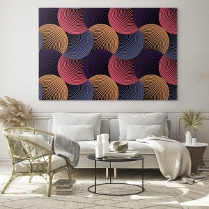 La pintura "En un ritmo circular" es una composición dinámica basada en círculos dispuestos con precisión, creando un llamativo patrón geométrico. Líneas concéntricas en tonos rojos, naranjas, morados y rosas forman un ritmo hipnótico que atrae la mirada e introduce una sensación de orden y energía en el interior. Es ideal para espacios que necesitan revitalización visual. Cada círculo está compuesto por líneas densamente espaciadas que atraen la atención y crean la impresión de un ritmo vibrante. La disposición similar de las formas crea una impresión tridimensional, como si los elementos vibraran y se movieran entre sí. Este efecto visual puede asemejarse a una interpretación contemporánea del arte óptico y tiene un efecto muy evocador en el espectador.