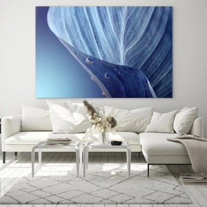 Cuadro sobre vidrio - Impresiones sobre Vidrio - Una hoja azul con gotas de agua visibles. - 70x100cm - Gotas ocultas de azul - Decoración de pared moderna para salón y dormitorio ARTTOR